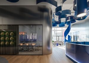 Уже на входе гости сталкиваются с первыми акцентами. Металлическая инсталляция, символизирующая путь компании, становится центральным элементом входной зоны. Она охватывает потолок зоны ресепшен и продолжается вглубь офиса в виде плавной линии голубого напольного покрытия.