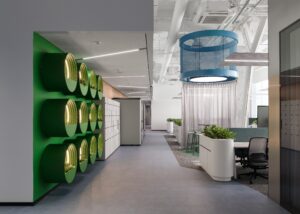 Поднимаясь на второй этаж, мы попадаем в длинный стеклянный коридор, который связывает множественно отделенных друг от друга помещений с панорамным видом на город. Это — то самое well-being пространство, в котором сотрудники могут переключиться с рабочих задач на отдых и немного отдохнуть в течение дня, что снижает уровень стресса и положительно влияет на продуктивность.