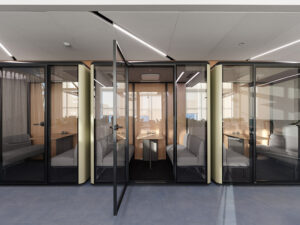 - центральное трансформируемое пространство, которое может превращаться в атриум, две переговорные, тренинг-зал или конференц-пространство — в зависимости от потребностей команды.