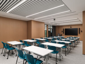 Сердцем современного оформления офиса стало трансформируемое пространство — многофункциональная зона, вмещающая в себя амфитеатр, переговорные, учебные и презентационные форматы. Пространство настраивается под один из двух сценариев: