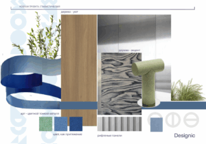 Нас вдохновили природные ландшафты, традиционные костюмы и культурный код Башкортостана, которые органично сплелись с узнаваемыми элементами фирменного стиля: графикой, отсылающей к трубопроводам и металлу, и характерной голубой палитрой. Центральным образом стала река — как символ движения, жизни и связи. Она «протекает» сквозь всё офисное пространство, связывая между собой open space, переговорные комнаты, зоны для печати, кофе-поинты, лаунжи, трансформируемые пространства и арт-зоны. Фирменный голубой — цвет воды — мы дополнили акцентами из живой зелени, теплого дерева и металлических поверхностей, отсылающих к индустриальному характеру компании. Чтобы придать пространству глубину и многослойность, мы интегрировали разнообразные арт-объекты, о которых далее расскажем подробнее.
